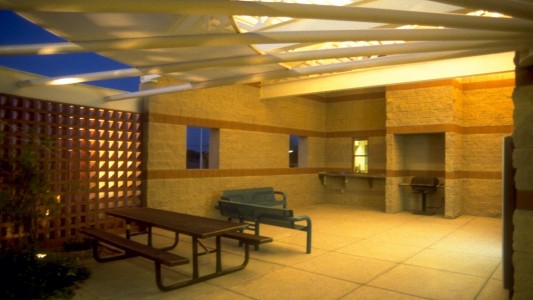 outside recreational and leisure space for avondale community center desinged by lea architects, an architecture firm based in Phoenix, AZ. Contemporary and aesthetic design to well fit the environment and community purposes.